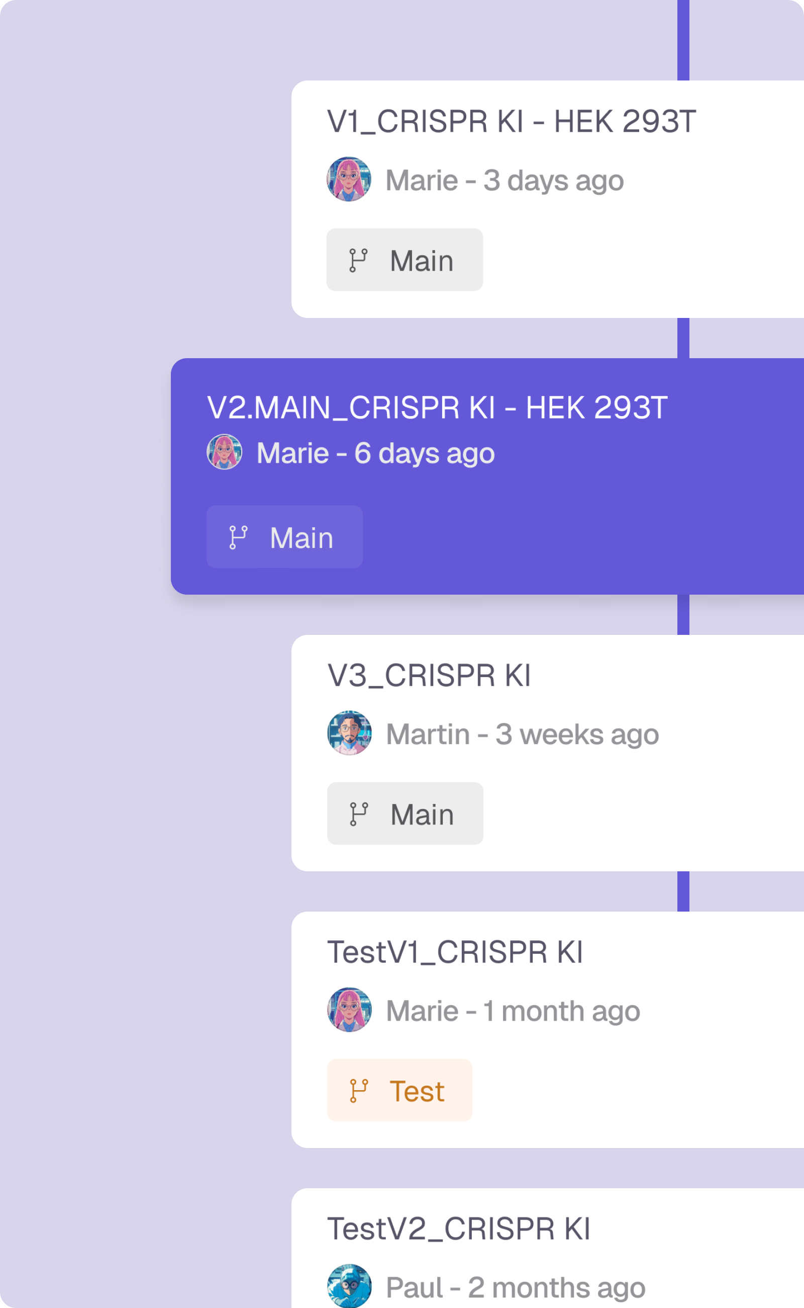 Just like coding, we built a sophisticated system of branches to help bioresearch teams document their progress and work through iterations. It’s simple and powerful.